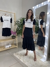 CONJUNTO COM T-SHIRT DE MANGAS BUFANTES - SAIA COM BABADOS E ELÁSTICO NA CINTURA - TECIDO CHARMOSO COM APLICAÇÕES EM FURINHOS